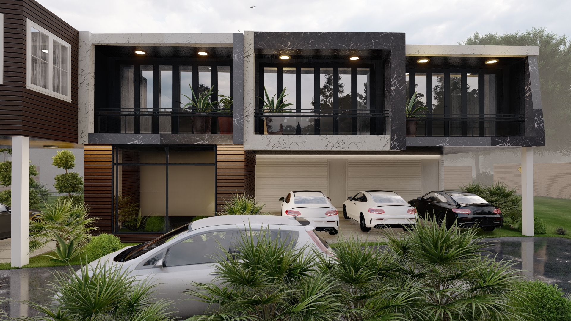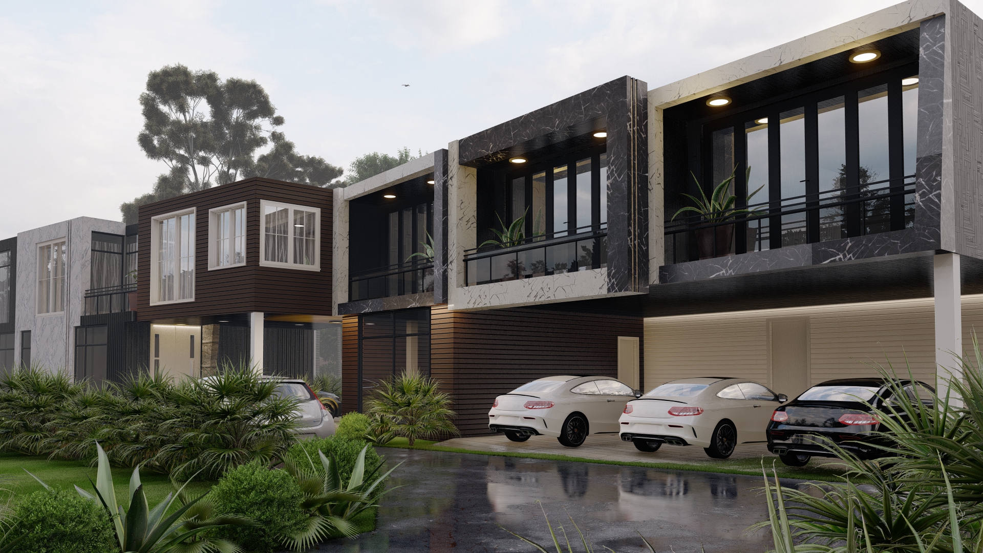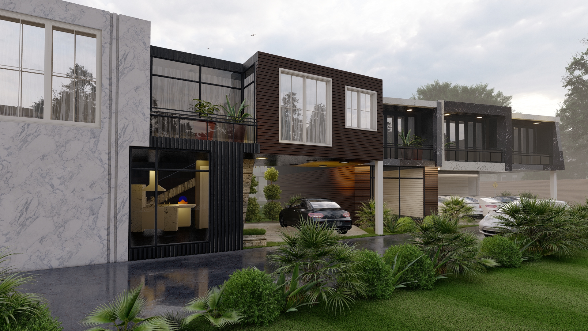 A carefully selected palette of high-contrast, modern materials—specifically, large format white and black marble-effect stone cladding, warm vertical wood paneling, and sharp black metal detailing—was instrumental in achieving depth and visual intrigue. The resulting design meticulously balances communal rhythm with private functionality, integrating covered carports and recessed balconies to blend openness with enclosure. The façade’s final refinement focused keenly on the play of light and shadow across these layered materials, resulting in an exterior that is bold, textural, and consistently appealing from one unit to the next.